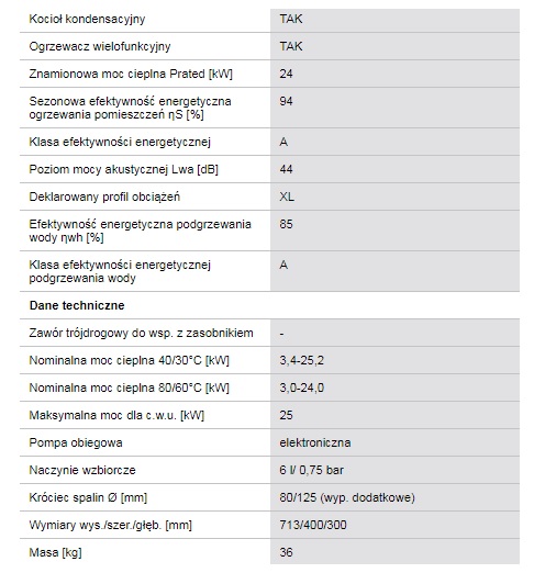 Kocioł ma szeroki zakres modulacji 1:8 oraz niewielkie wymiary. Może on oszczędnie produkować ciepło dla potrzeb ogrzewania i podgrzewania wody użytkowej zapewniając wysoki komfort zarówno w małych mieszkaniach, większych apartamentach, segmentach lub budynkach wolnostojących.
