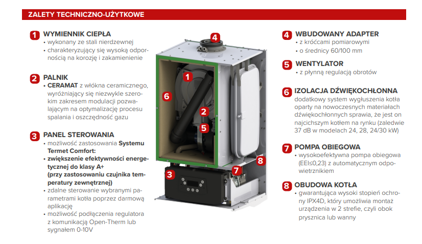 - bardzo cicha praca kotła – zaledwie 37 dB (dot. kotłów 24, 28 kW)