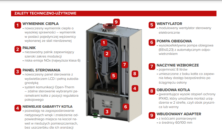 ECOCONDENS SLIM to nowoczesny i ekologiczny kocioł kondensacyjny, którego jedną z głównych zalet są niewielkie wymiary co sprawia, że jest on jednym z najmniejszych kotłów kondensacyjnych oferowanych na rynku. Jego kompaktowy rozmiar (wysokość 777 mm, szerokość 400 mm, głębokość 250 mm), a w szczególności mała głębokość sprawia, że nadaje się idealnie do montażu w małych i ciasnych wnętrzach. Sprawdzi się także w istniejących już instalacjach, w których dokonanie zmian pod nowe źródło ciepła jest utrudnione ze względu na istniejące ograniczenia. Dzięki szerokiemu zakresowi modulacji stanowi on doskonałe rozwiązanie dla obiektów o małym zapotrzebowaniu na ciepło. W kotle zastosowano nowoczesny wymiennik ciepła o wysokiej sprawności i dużej odporności na korozję. Nowoczesny palnik gwarantuje szeroki zakres modulacji w przedziale 13%-100% oraz zapewnia niską emisję tlenków azotu (klasa NOx-6) co jest niezwykle ważne w kontekście ochrony środowiska. ECOCONDENS SLIM wyposażony jest w protokół Open-Therm, który zapewnia komunikację pomiędzy kotłem, a regulatorem temperatury umieszczonym w pomieszczeniu.