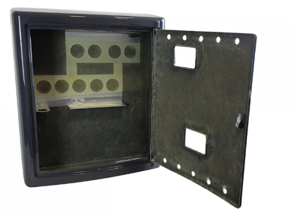 Obudowa z płaskim spodem wyposażona w stelaż do montażu uchwytów gazomierzy. Płaski spód umożliwia montaż na postumencie.